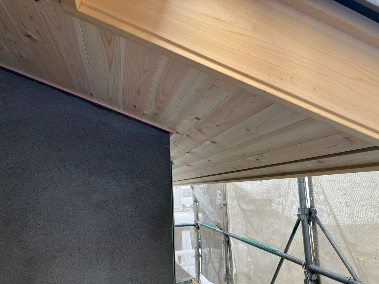 千曲市の家の土壁の様子。天井は杉です。左側の養生シート越しに透けて見えているのが板倉壁です。
